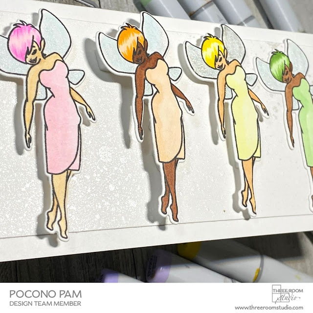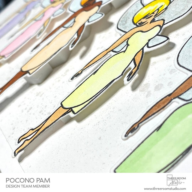 I then arranged the fairies onto the card panel popping the center 3 fairies with foam dots to add dimension.