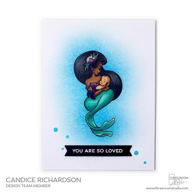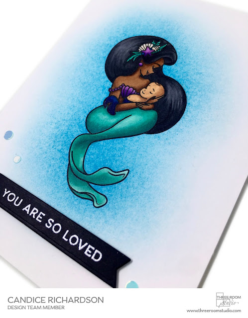I started by stamping the mermaid on a piece of 4.25 x 5.5 inch white cardstock in black amalgam ink. I also stamped her on a Post-it note and fussy cut to create a mask. After adhering the mask onto my panel, I used a blending brush and a very light hand to blend a halo of distress ink (I used Mermaid Lagoon) around her. Next I peeled off the mask (my favorite part!) and Copic colored the mermaid and her little baby! I finished it off by white heat embossing the "You are so loved" sentiment on a black cardstock banner, and adding some little sequins.