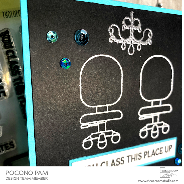 Next, I stamped the forward facing chair image twice with clear embossing ink and heat embossed them fine white embossing powder.