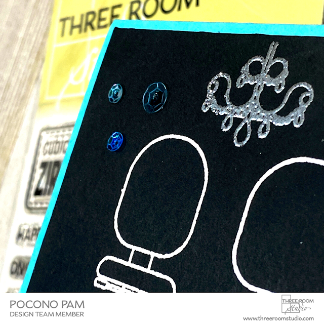 I used the Cubicle Zirconia clear stamp set to create my card. The turquoise card base is measured at 4" X 4". I then cut the black card panel at 3 7/8" X 3 7/8". I used a powder tool to prep the black panel. This removes static and oils from the cardstock.