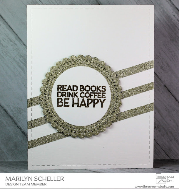 For the card, I die cut a circle from a piece of pretty gold glitter paper and also cut three small strips and glued them diagonally on the paper. The sentiment from the "One More Chapter" stamp set was embossed with Liquid Platinum embossing powder and attached to the scalloped die cut. The last step was to glue the circle down over the strips of glittery paper, put a sentiment inside and the card is finished. It worked up very quickly and is perfect for a friend who loves to read.