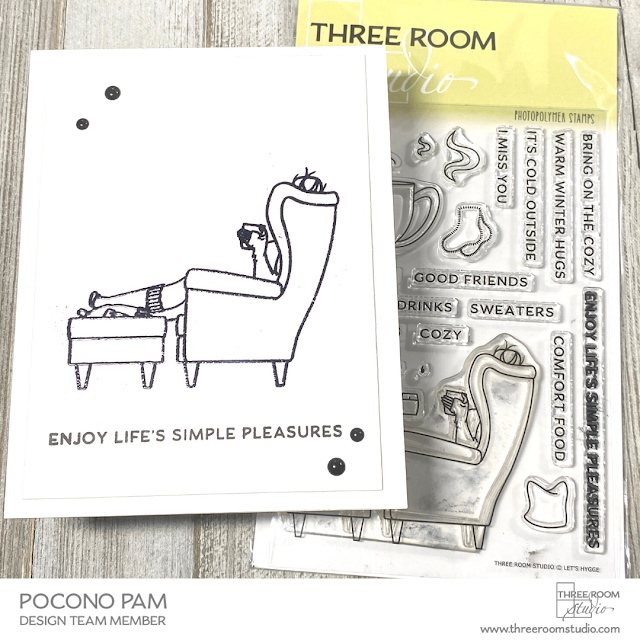 I used the Let's Hygge clear stamp set to create my card. I started by heat embossing the image onto a 3 3/4" X 5 1/8 " card panel. Once cooled, I stamped a sentiment from the set beneath the image. I added a few black enamel dots.
