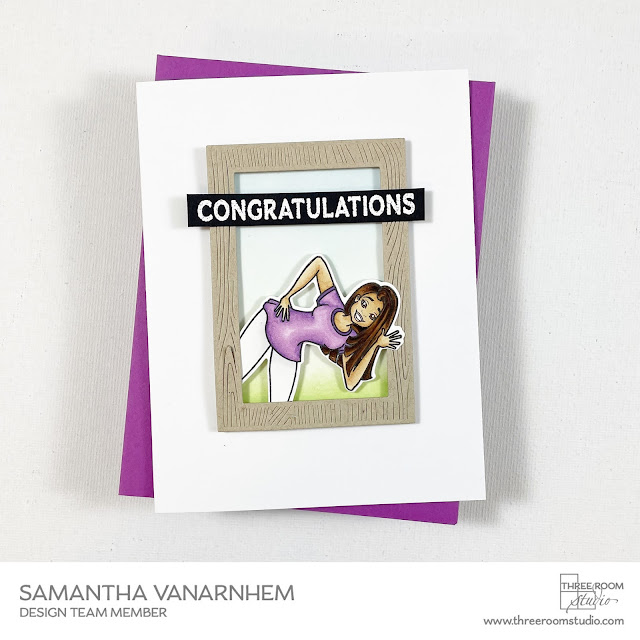I finished this card with the a large "congratulations" banner using a sentiment from the Cubicle Zirconia stamp set heat embossed onto black cardstock and trimmed to fit across the frame.