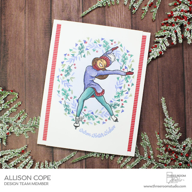 Today I decided to feature one of my favourite winter stamp sets, "Skate Sleep Repeat". This stamp set not only features our beautiful figure skater but a larger wreath banner and all kinds of tiny winter branches and berries. I chose to make a sort of wreath wrapping all around her.