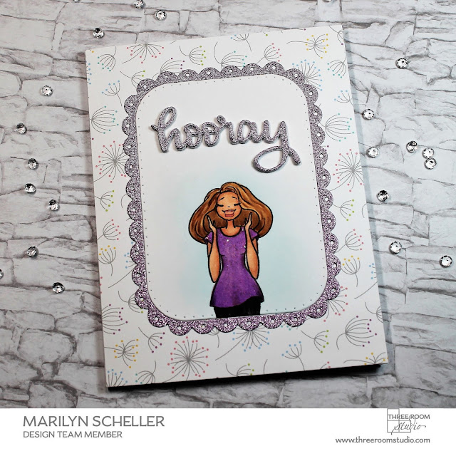 I'm always up for some glitter and sparkle so it's a perfect theme for me but as usual, I struggle with photographing sparkly pieces. The white dots are actually a reflection of the Stickles I added to her shirt but it makes me wish I would have added a lot of dots with a pen. Keeping with the theme, I used purple glitter paper for the outline and the sentiment using the 'hooray' die from the Yay die set. Three more layers were cut from plain white cardstock and all together for some dimension. The image was stamped and coloured with Copic markers.