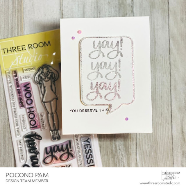 I created my Clean and Simple cards using the Three Room Studio YAY! stamp set. I stamped a sentiment onto a card base. I then stamped one of the YAY! sentiments three time onto a speech bubble die cut with VersaMark ink. I heat embossed pink glitter. I then popped it up on the card base with foam squares.